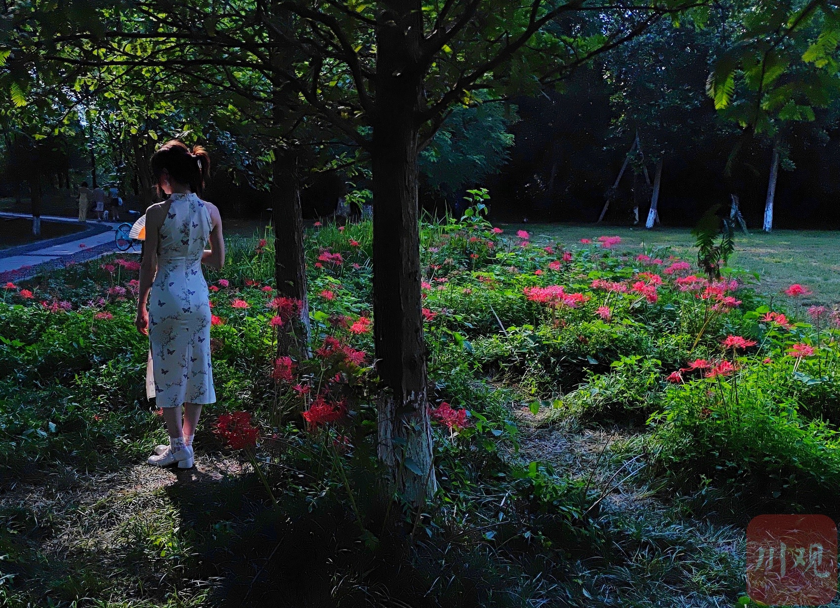 在石蒜花群里拍照打卡的市民。