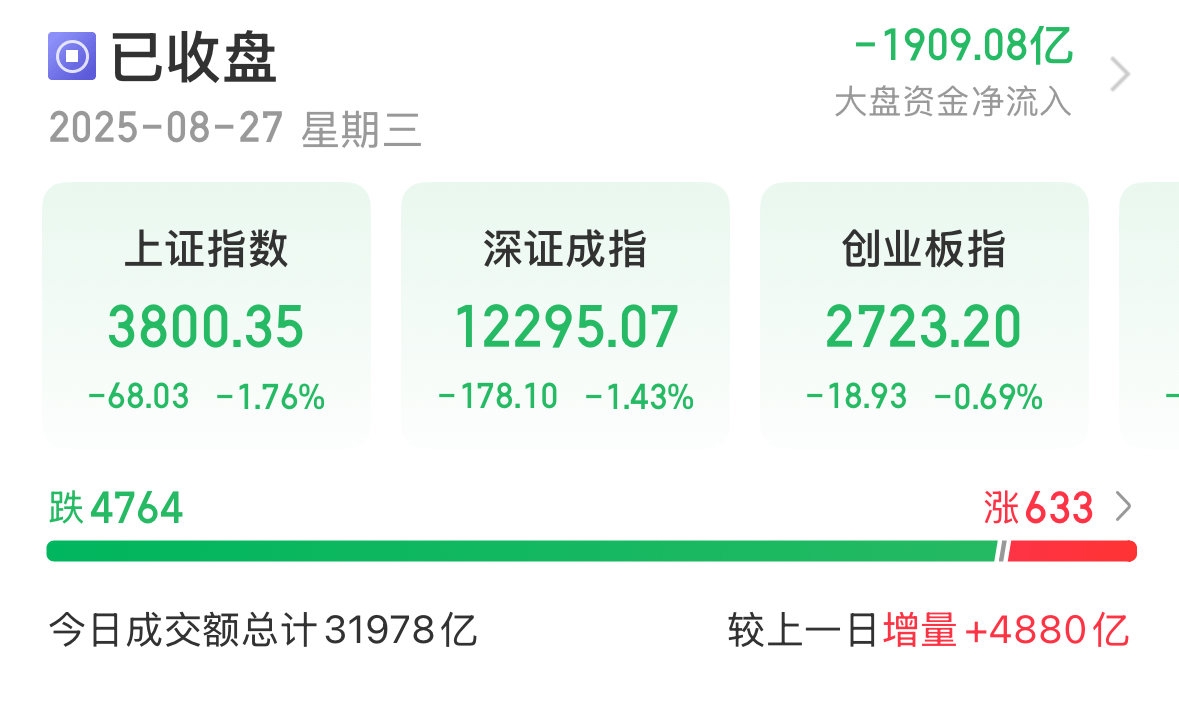 8月28日,A股三大指数集体在午后跳水。截至收盘,上证指数跌1.76%,收报3800.35点;深证成指跌1.43%,收报12295.07点;创业板指跌0.69%,收报2723.20点。全市场全天成交额31978亿元,较上日放量4880亿元。全市场超4700只个股下跌,仅有633只个股上涨,其中涨幅在0%至3%的占388只。