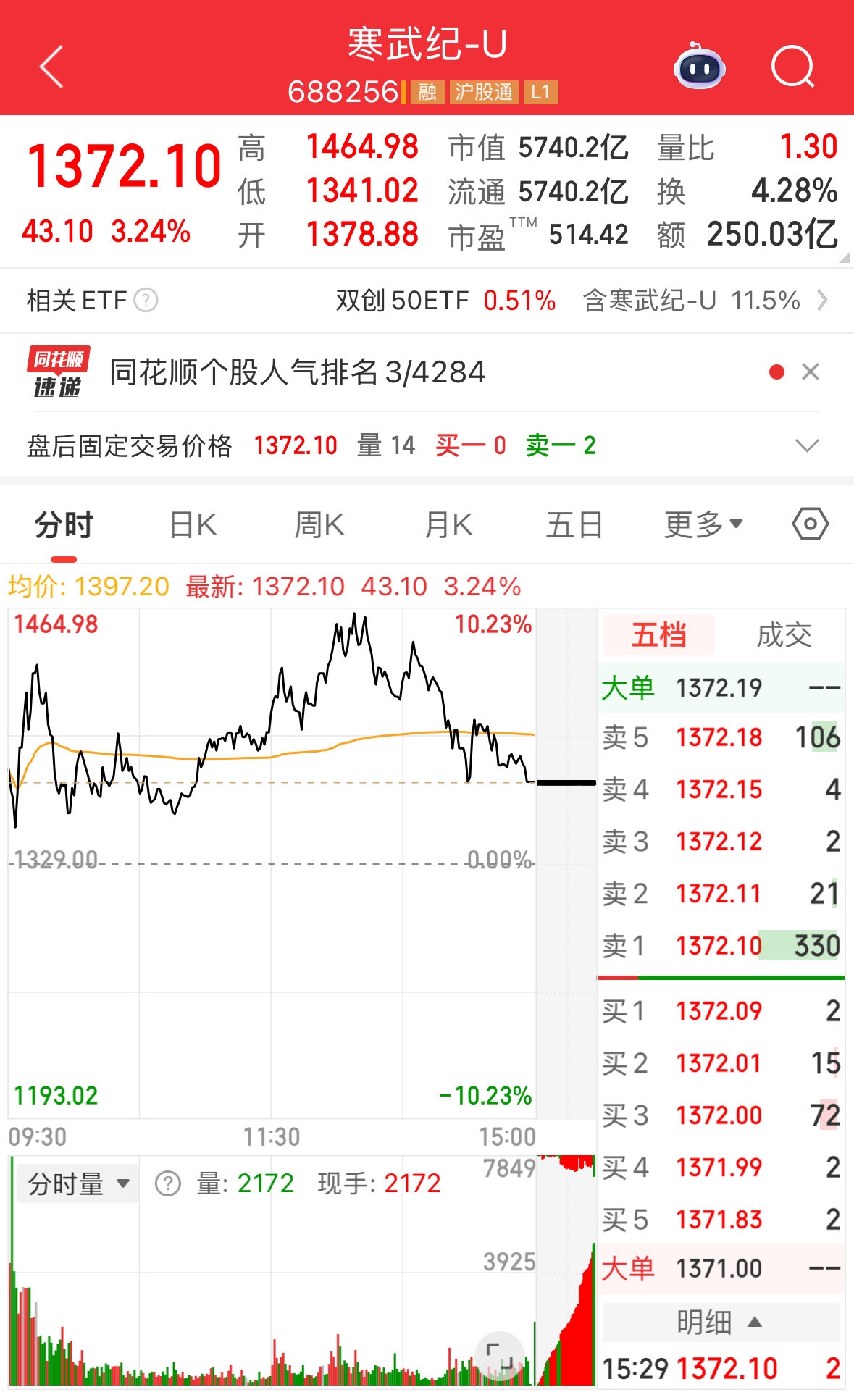 在今日争霸赛中,双方你追我赶,差距不大。寒武纪午后13时38分左右,触及1464.98元,同一时间,贵州茅台股价为1460.93元,短暂成为A股市场的新晋“股王”。不过寒武纪尾盘回落,茅台惊险守住了“股王”宝座。截至今日收盘,寒武纪股价报1372.10元每股,单日涨幅3.24%,总市值达到5740亿元;贵州茅台股价报1448元每股。两股股价仅相差75.9元。