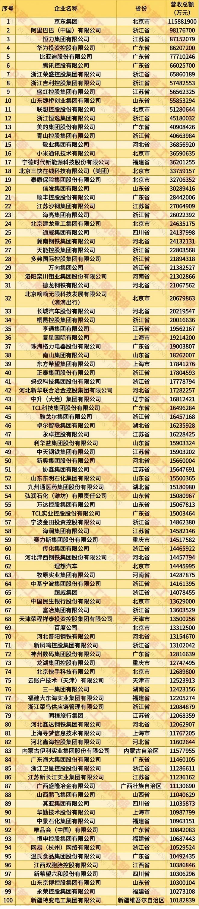 榜单显示,京东集团、阿里巴巴(中国)有限公司、恒力集团有限公司分列前三名。华为投资控股有限公司位列第四,比亚迪股份有限公司、腾讯控股有限公司分别位列第五、第六,小米通讯技术有限公司则排在第十六位。