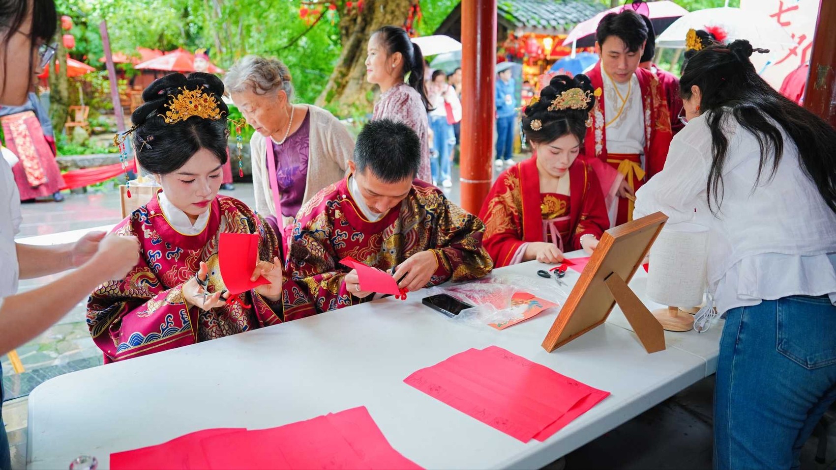 仪式结束后,花间喜事新人巡游暨游园打卡活动开启。古琴体验区乐声悠扬、非遗剪纸区巧手生花、古巷投壶笑声不断……新人与游客并肩穿梭在古街商铺间,在手作摊位前参与互动,带着集满印记的卡片兑换定制祝福礼。