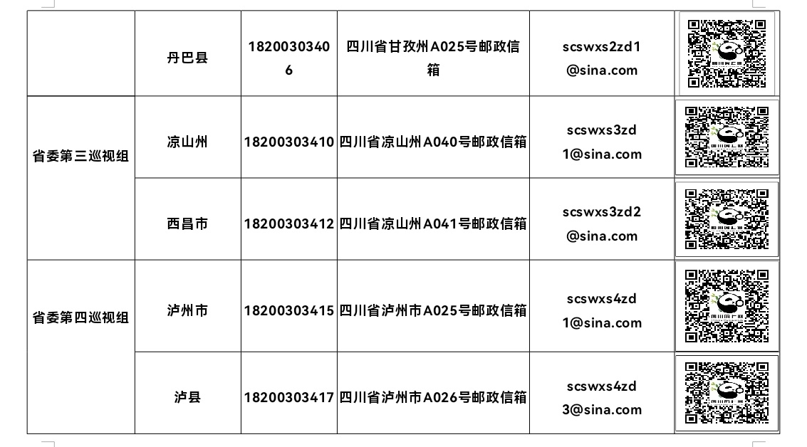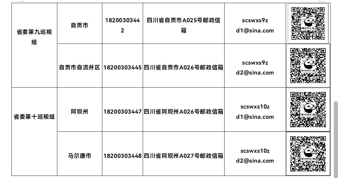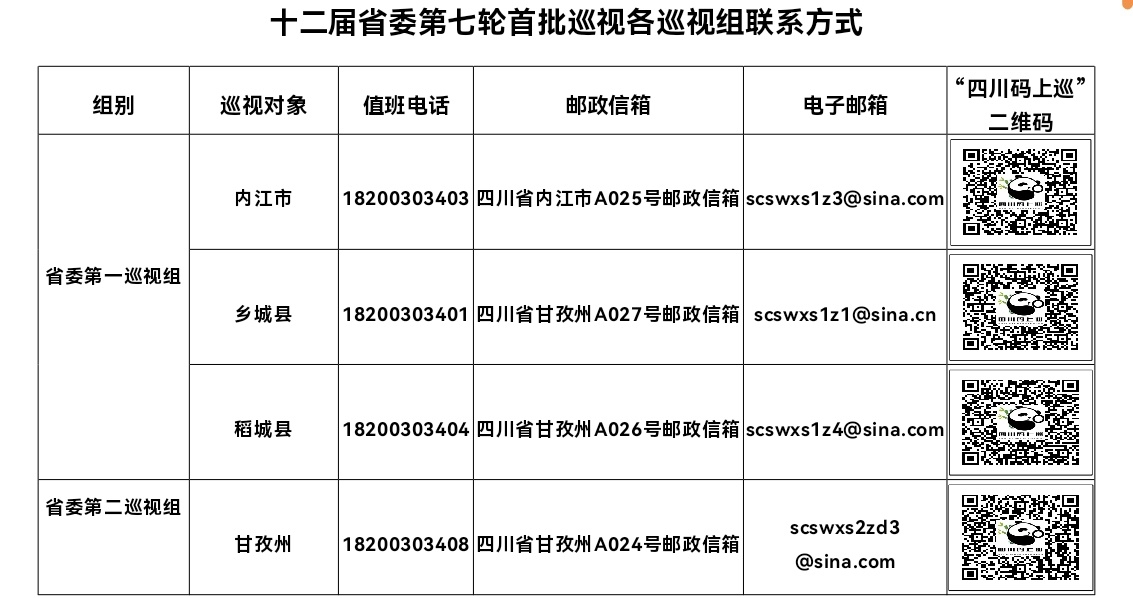 巡视期间,各省委巡视组设置了值班电话、邮政信箱、电子邮箱和“四川码上巡”二维码。巡视组主要受理反映被巡视党组织领导班子及其成员和下一级党组织领导班子主要负责人,以及重点岗位人员问题的来信、来电、来访,重点是关于违反政治纪律、组织纪律、廉洁纪律、群众纪律、工作纪律和生活纪律以及巡视整改等方面的问题反映。对其他不属于巡视受理范围的信访问题,将按规定由被巡视地区和有关部门认真处理。