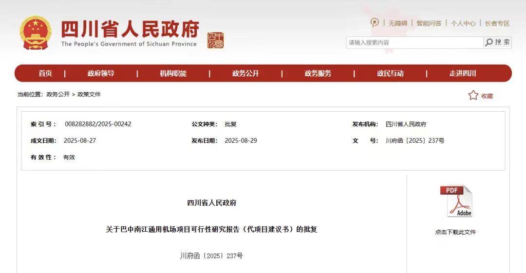 8月29日,记者从四川省人民政府网站获悉,巴中南江通用机场项目可行性研究报告获得省政府批复,原则同意实施。