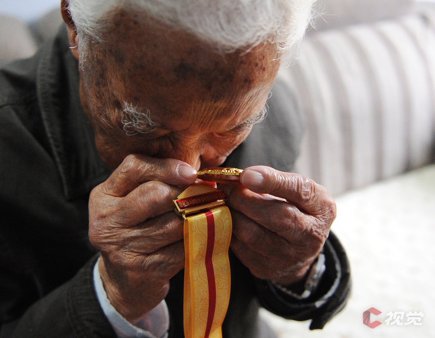 2015年,101岁的抗战老同志赵世新,端详自己获得的中国人民抗日战争胜利70周年纪念章。