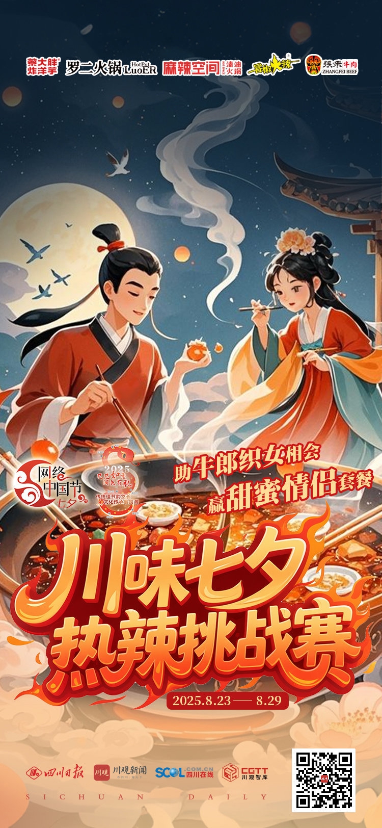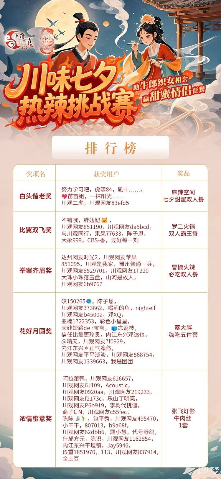 本次“川味七夕热辣挑战赛”活动积分将按比例计入2025年“网络中国节”“巳巳如意 闯关有礼”活动总排行榜。重阳节活动结束后,总排行榜排位靠前的用户还将获得额外奖励。