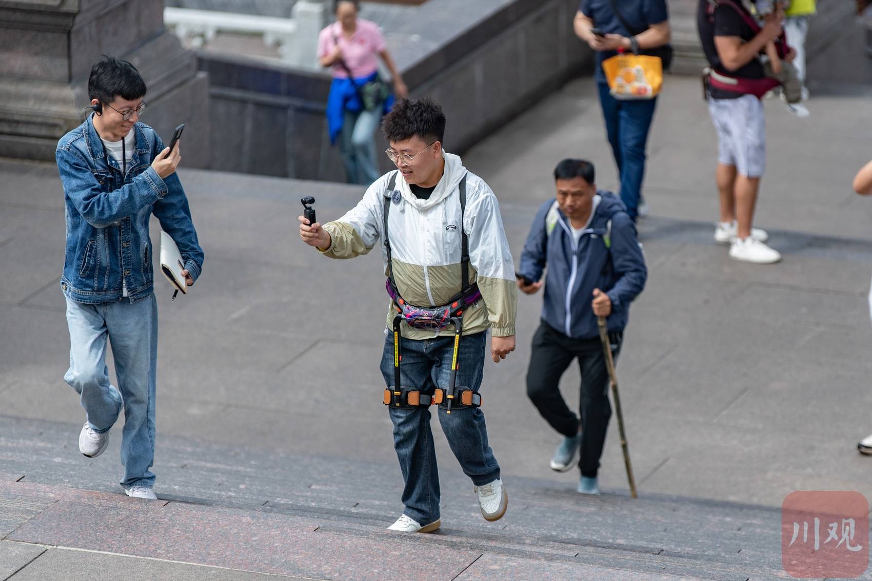 9月3日,游客穿戴外骨骼机器人登峨眉山,并用相机记录下新体验。