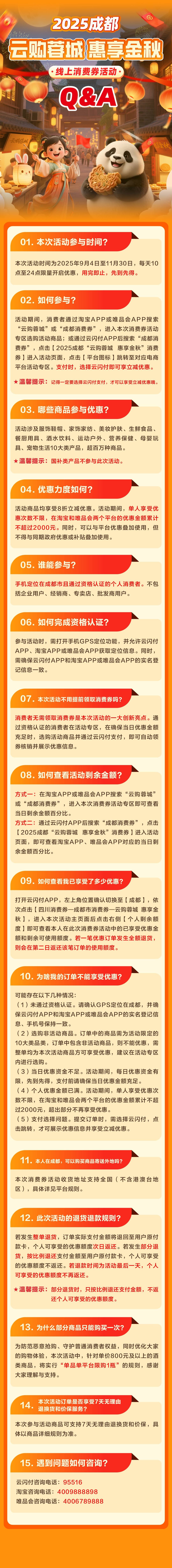 准备好了吗?2025成都“云购蓉城 惠享金秋”线上消费券活动将于9月4日早上10点准时开启!3000万元消费券等你来拿,10大品类,超百万种商品,享受8折立减优惠,单人优惠次数不限,累计最高可省2000元!