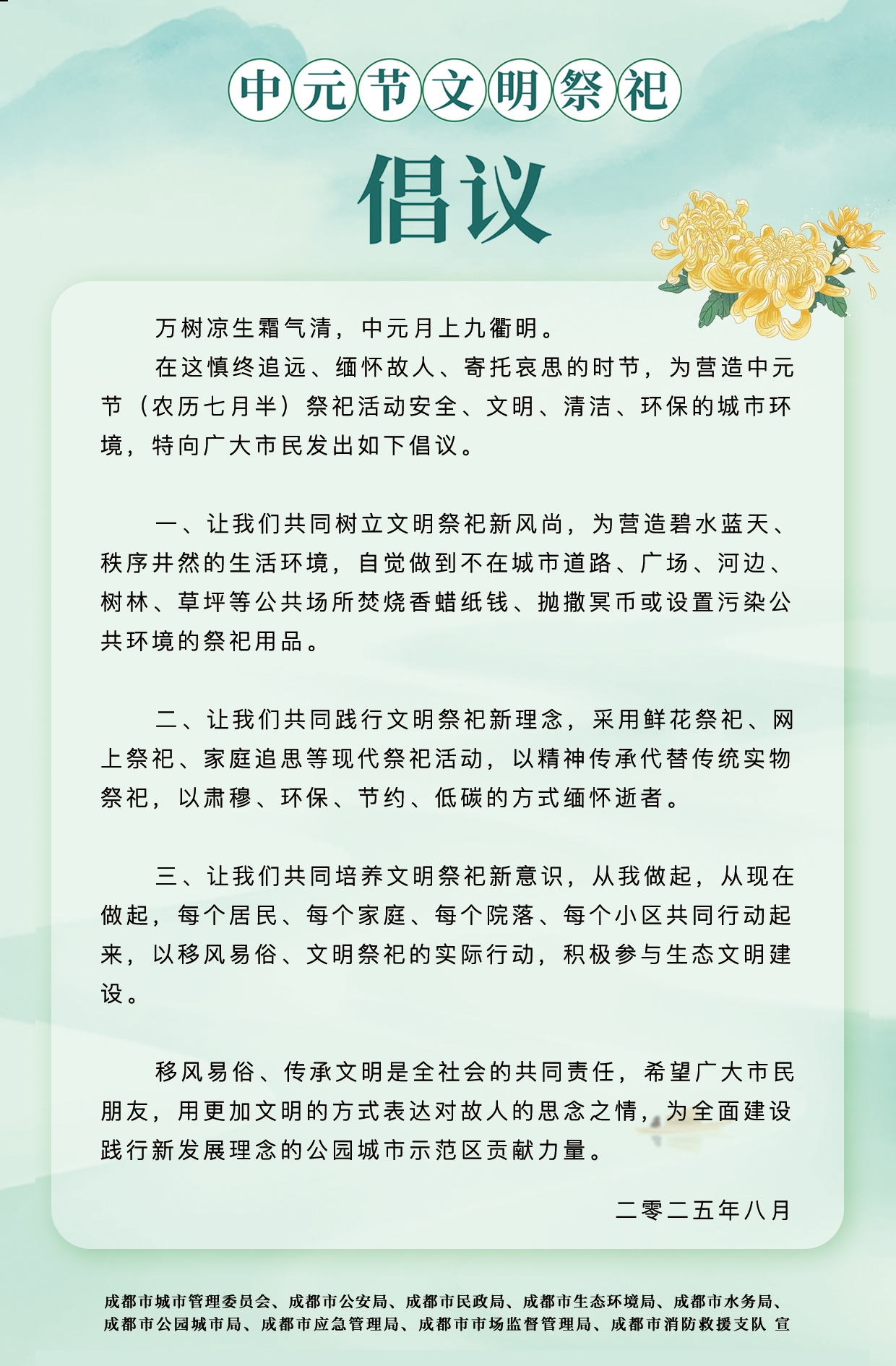 中元节即将来临,近日,成都市城市管理委员会、成都市公安局、成都市民政局、成都市生态环境局等9部门,面向广大市民群众发出联合倡议:文明追思、平安祭祀,践行文明祭祀新理念,以肃穆、环保、节约、低碳的方式缅怀逝者。
