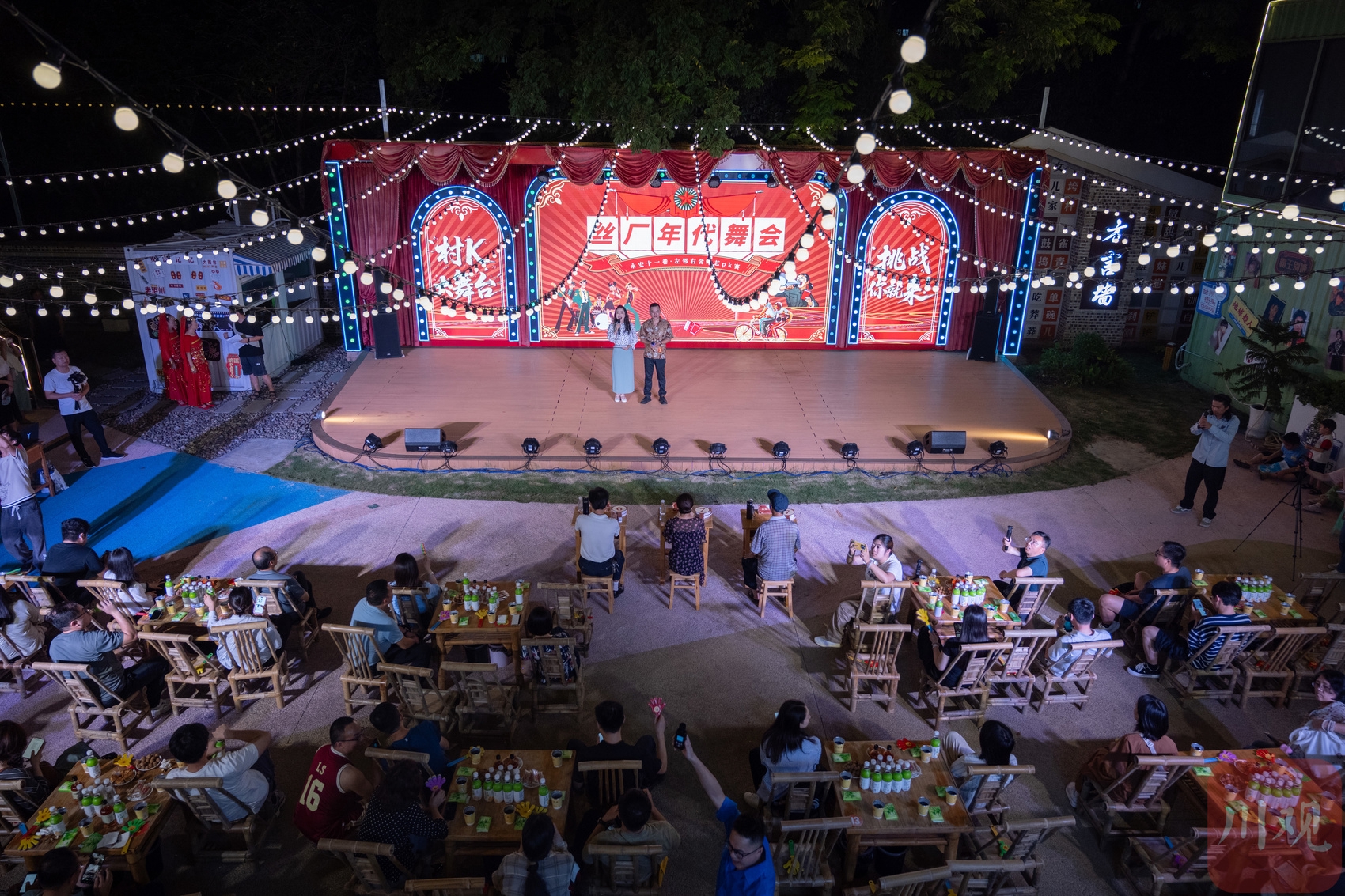 夜幕下,经过重新打造的丝厂旧址,霓虹灯流光溢彩,老歌一首接着一首,瞬间将人拉回八九十年代。当晚,首次举办的“村K大舞台,挑战你就来”活动,更是将现场氛围掀向高潮。