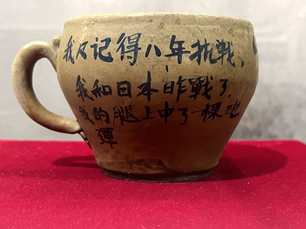 重庆建川博物馆内收藏的抗战老兵用过的粗陶杯,上有文字:“我只记得八年全面抗战,我和日本昨(作)战,我的腿上中了一棵(颗)炮弹。我坚决打到底,没有下(火)线!”(曾勋/摄)