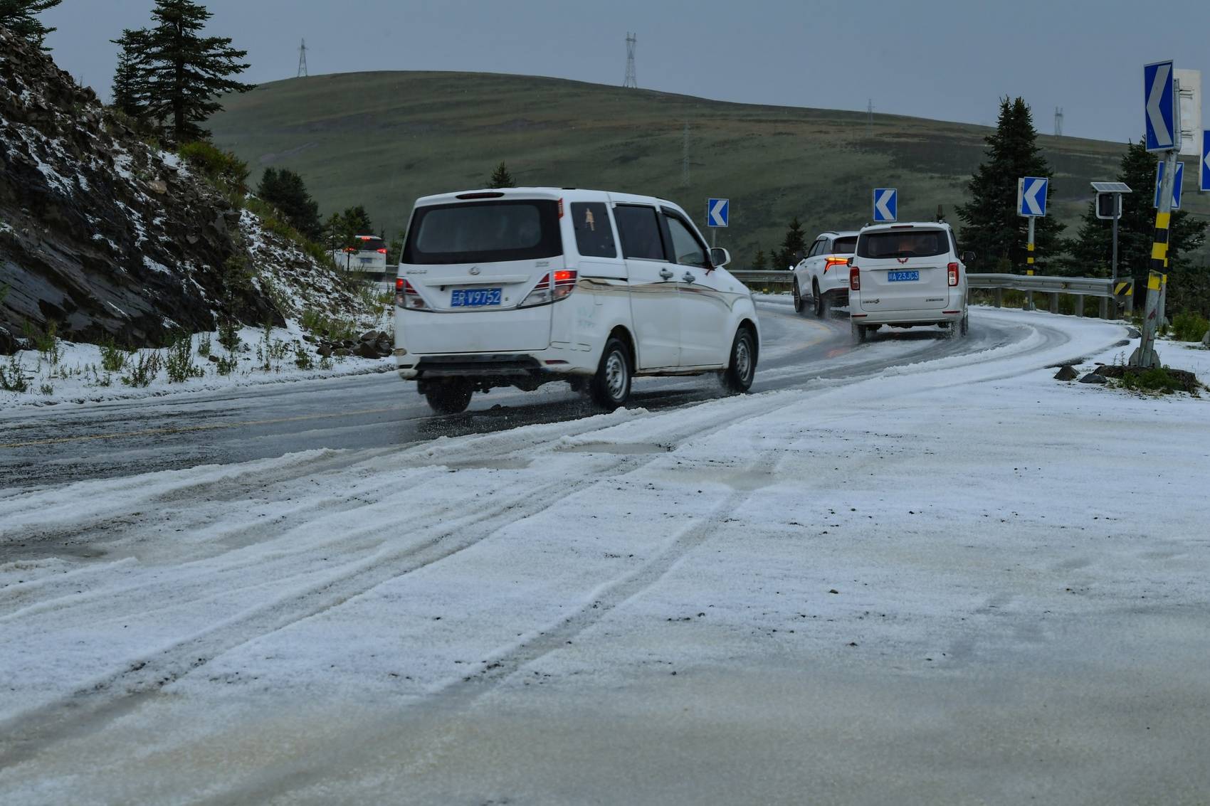 2025年9月5日下午,海拔4318米的四川省甘孜州理塘县梅朵措观景台打卡点附近迎来密集冰雹。