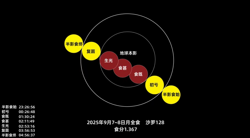 从具体的时间来看,根据中国科学院紫金山天文台的预报,9月8日00:27为“初亏”,01:31为“食既”,02:12为“食甚”,02:53为“生光”,全食阶段过后,月球将于03:56“复圆”,全程约3.5小时。