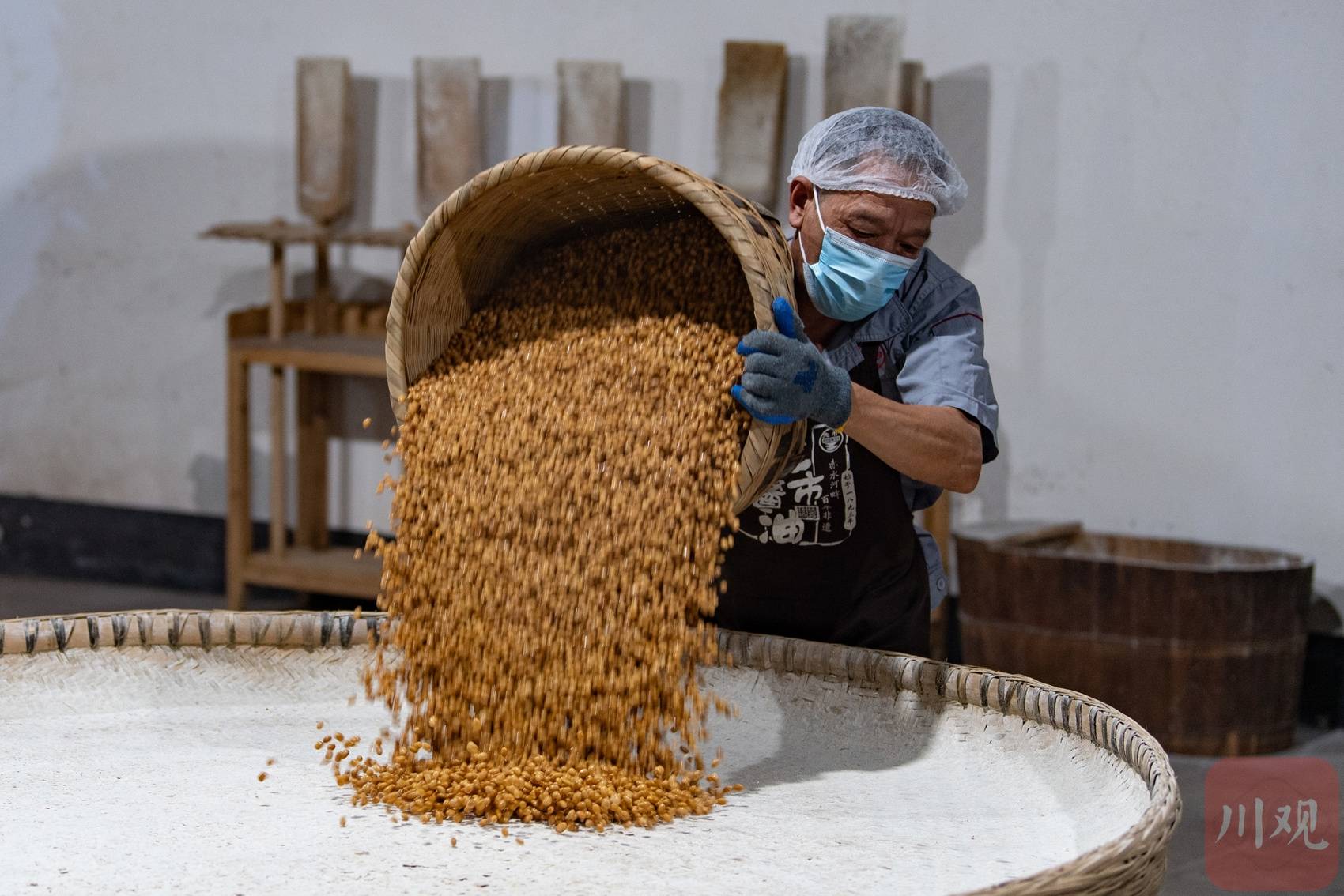 9月5日,在泸州合江县先市酱油酿造基地的工坊内,工人蒸煮黄豆,并将其晾晒入缸。