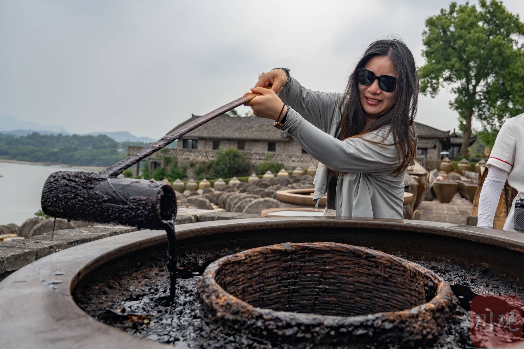 9月5日,游客在泸州合江县先市酱油酿造基地“打酱油”。
