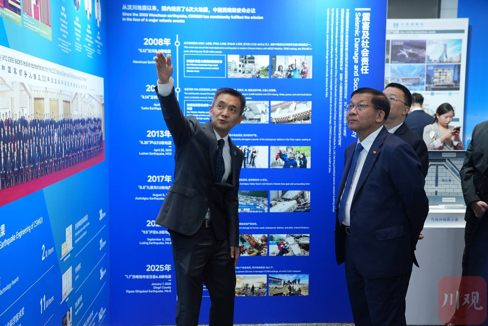 在抗震技术与灾后重建主题展示区,敏昂莱停留良久,与中建西南院总工程师和技术团队深入交流。院方系统介绍了全套抗震设计体系,详细阐释了“安全优先、民生为本” 成熟经验与技术管理模式。