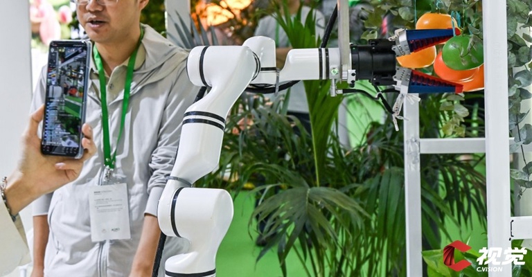 9月4日,农博会上展出的AI采摘机器人,安装有高光谱摄像头,能精准采摘水果并将其放入筐中。