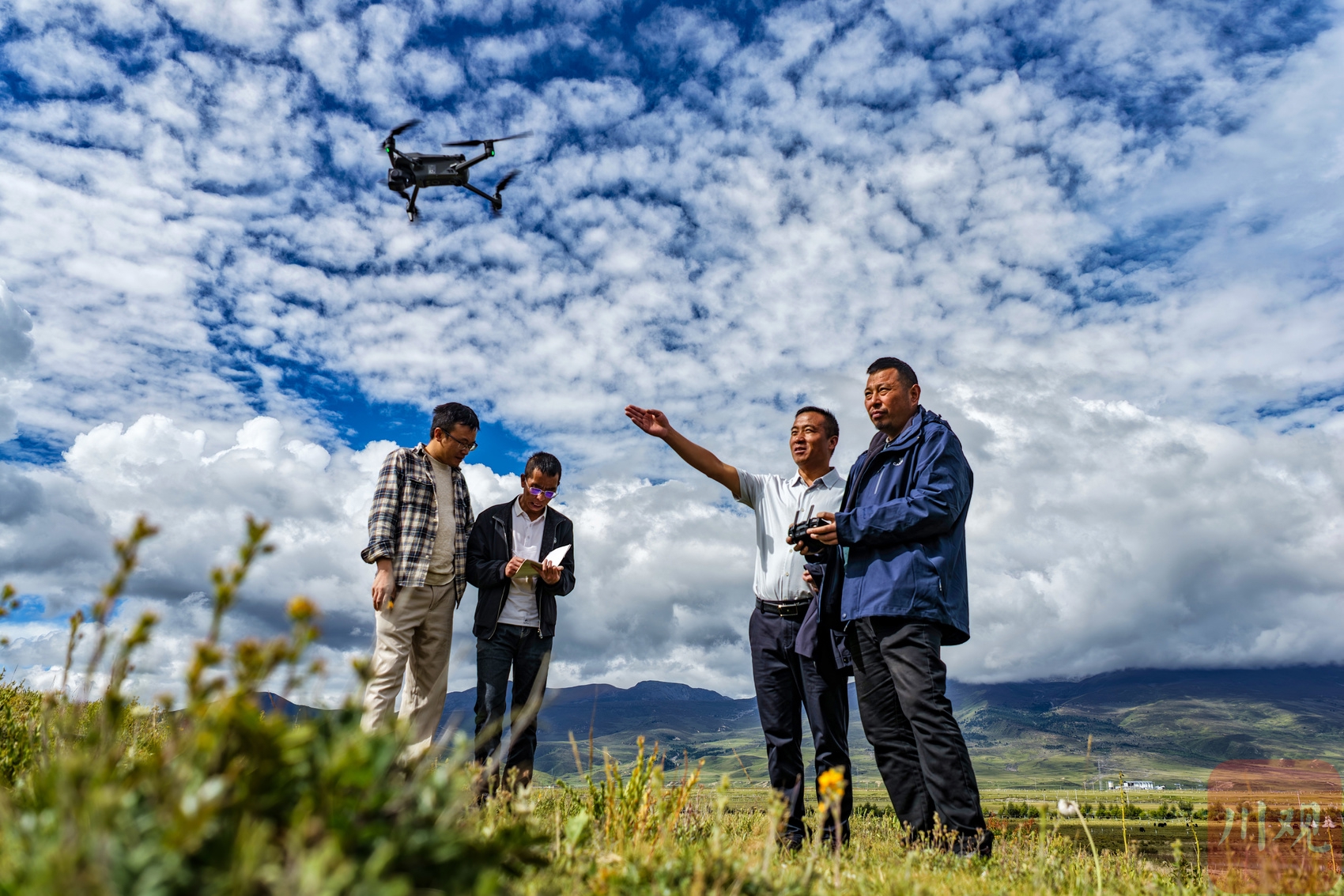 2025年9月4日,四川省甘孜州理塘县林业和草原局工作人员在海拔4000多米的高原上通过无人机查看草原生态情况。