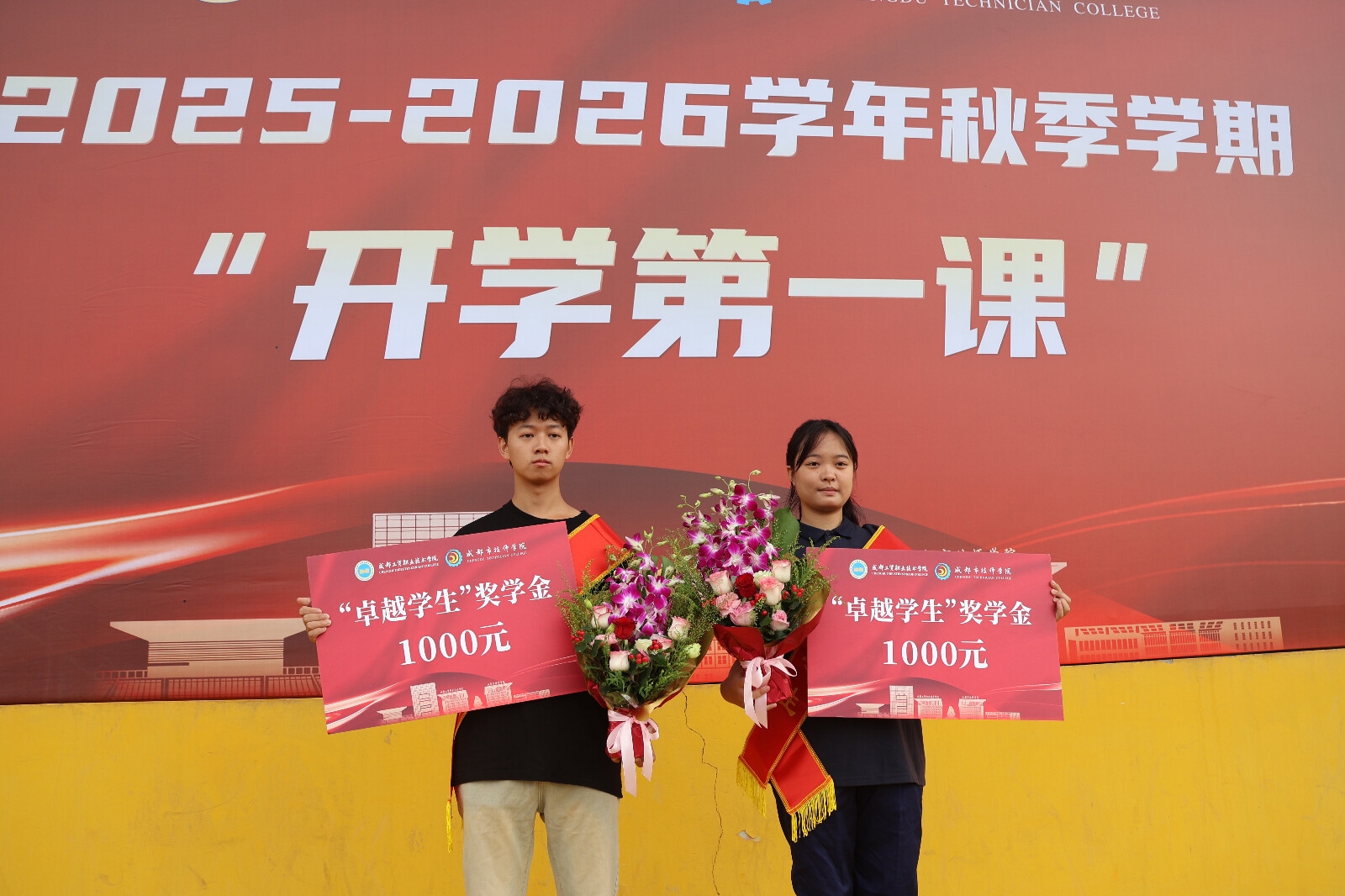 在这场开学第一课上,学校党委书记王涛为这2名受表彰的学生发放“卓越学生”奖学金,勉励全体同学要坚定“技能报国”的理想信念,将个人发展融入国家需要,以今日之所学,服务国家。校长陈大勇希望全体同学以榜样为镜,珍惜每一次学习机会,投身每一次实训操作,在锤炼中成长,在磨砺中闪光。