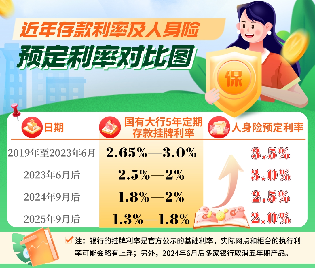 从2023年6月起至2025年9月,人身险预定利率经历了快速下调:从3.5%逐步降至3.0%、2.5%,直至2025年9月正式进入“2.0%时代”,三年时间降幅超过40%。