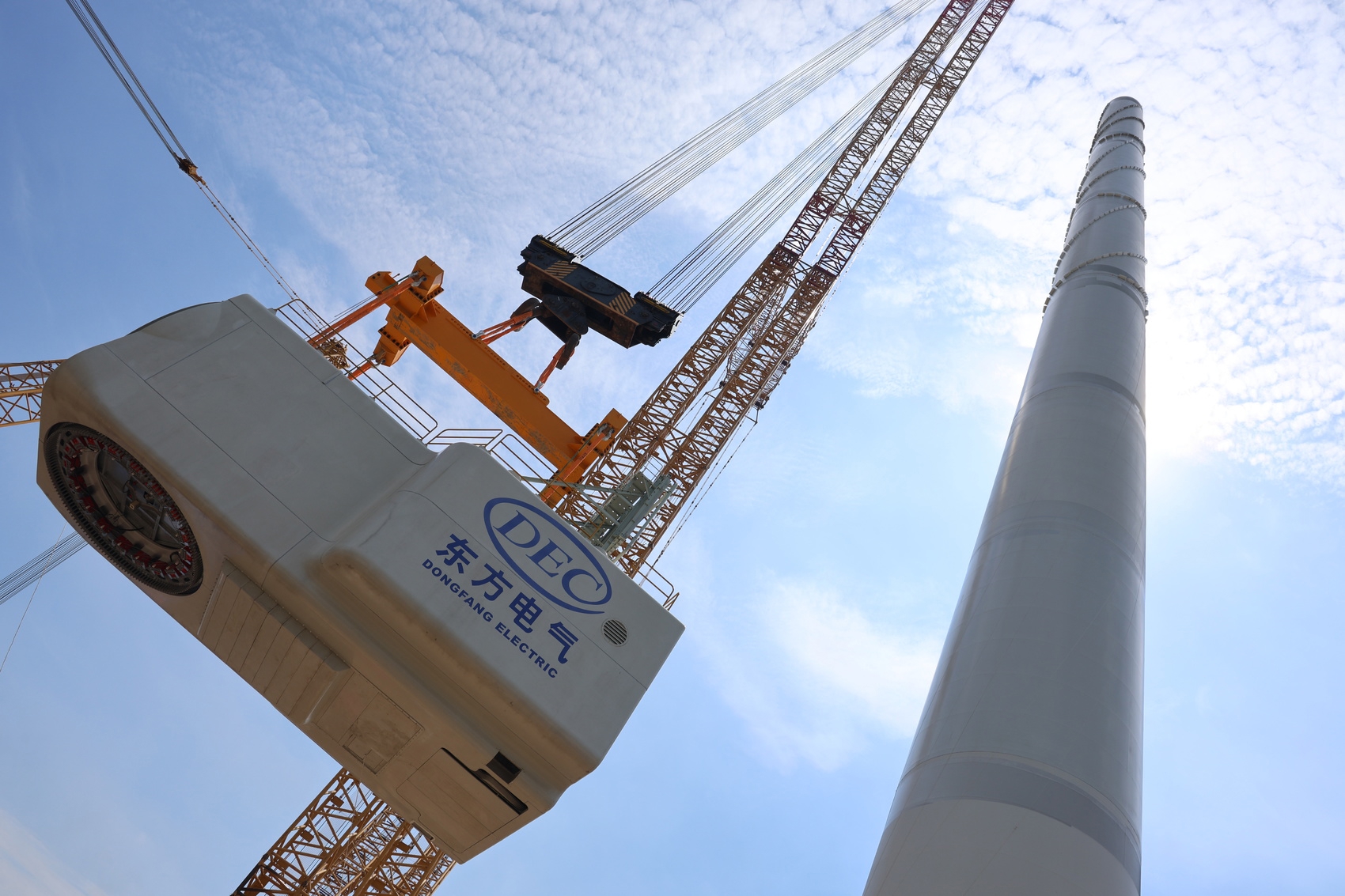 8月29日,由东方电气集团完全自主研制的全球最大26兆瓦级海上风电机组,在东营风电装备测试认证创新基地成功吊装。东方风电供图