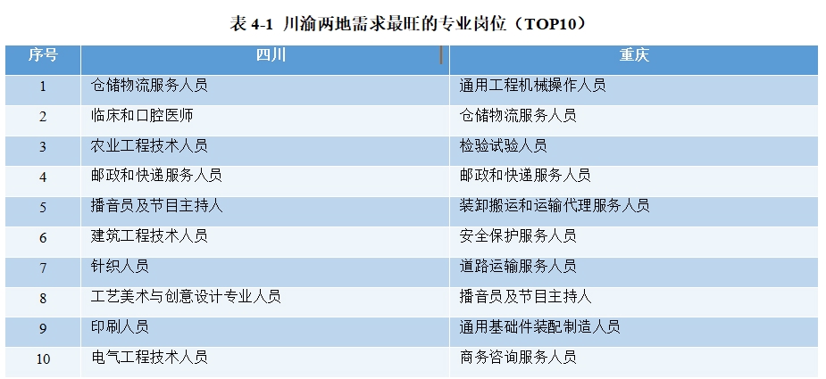 通过模型量化分析,发现成渝两地重度需求人才包括:仓储物流服务人员、临床和口腔医师、电气工程技术人员等36类;中度需求人才包括检验检疫工程技术人员、信息通信网络运行管理人员、电子设备装配调试人员等64类。