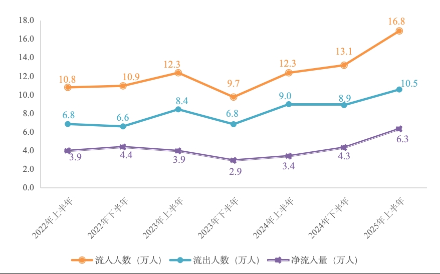 随着成渝地区双城经济圈建设成势见效,两地产业人才双向流动频繁,总体呈现“西进东出”态势。今年上半年,四川流入人才中14.7%来自重庆,16.1%流出人才去往重庆,充分说明成渝地区已形成较为顺畅的市场化人才流动机制。