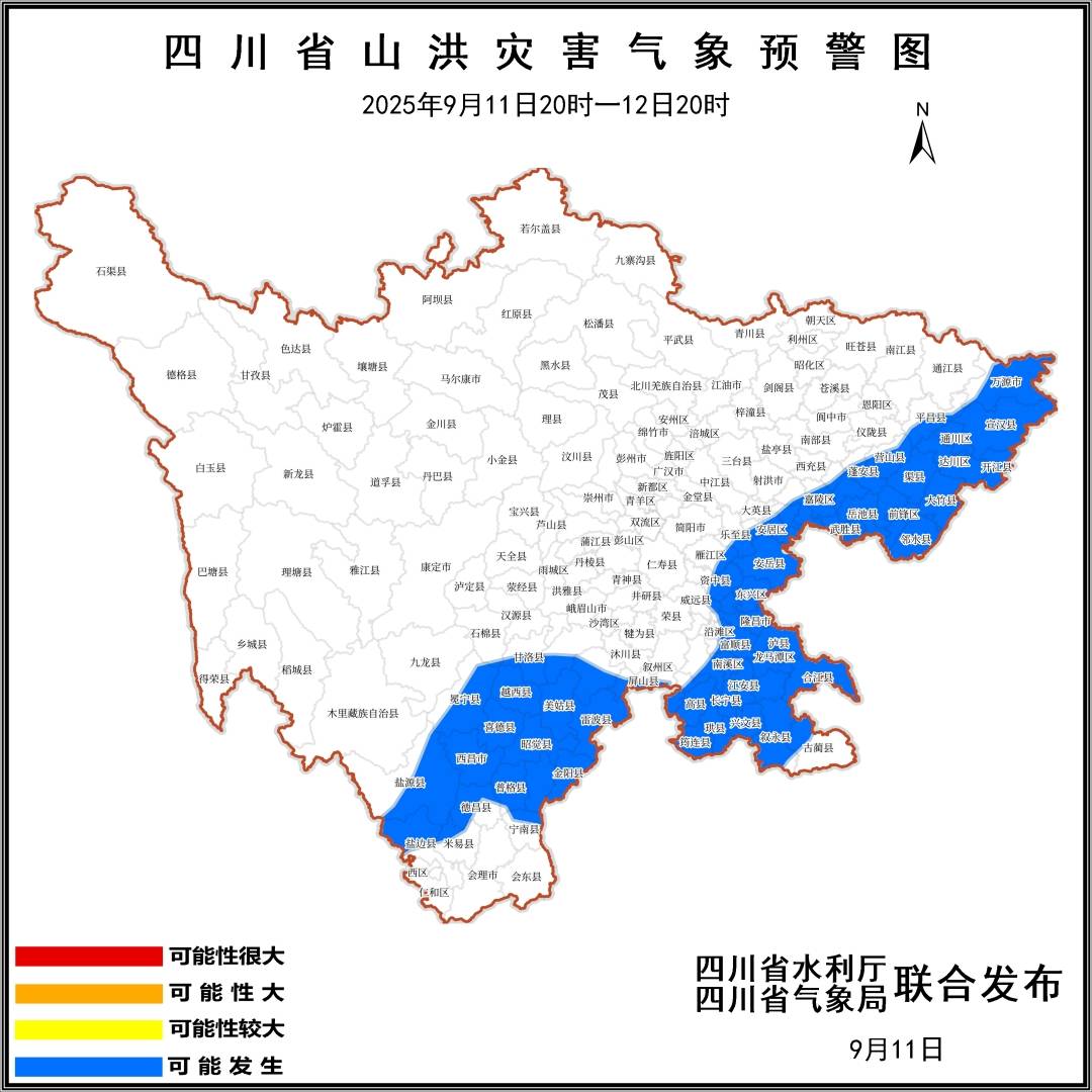 2025年9月11日20时至12日20时,内江市东兴、隆昌、市中区、资中、威远,广安市广安、邻水、前锋、岳池、华蓥、武胜,泸州市纳溪、泸县、龙马潭、合江、江阳、叙永、古蔺,达州市大竹、开江、达川、渠县、通川、宣汉、万源,资阳市安岳、乐至、雁江,宜宾市江安、兴文、南溪、筠连、珙县、长宁、高县、屏山、翠屏、叙州,遂宁市安居、船山、蓬溪,自贡市富顺、大安、沿滩,南充市高坪、嘉陵、营山、蓬安、顺庆,凉山州雷波、越西、美姑、西昌、喜德、冕宁、甘洛、盐源、昭觉、布拖、金阳、德昌、宁南、普格,攀枝花市盐边、米易,乐山市马边、峨边,巴中市平昌,雅安市石棉等14个市(州)69个县(市、区)可能发生山洪灾害。