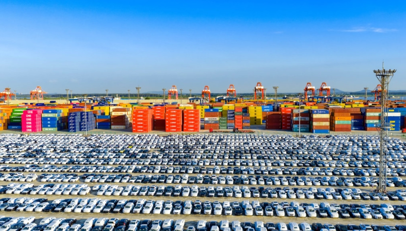 新能源汽车在江苏南京龙潭港集装箱码头等候运输。