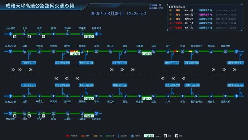 为确保借道期间行车安全,成雅高速在借道路段部署了完整的机电设备组合——在起始点设置通行信号灯、标识牌、LED提示屏,明确标注“应急车道临时借用起点”;在终点分三级设置提醒标识,避免变道不及时引发剐蹭;全时段保障所有标识采用高反光材质,夜间通行同样清晰可见。同时,高速公安、交通执法部门与成渝公司成雅高速路产管护人员建立联勤联动机制,结合现场巡查情况动态疏导车流,确保借道期间秩序井然。