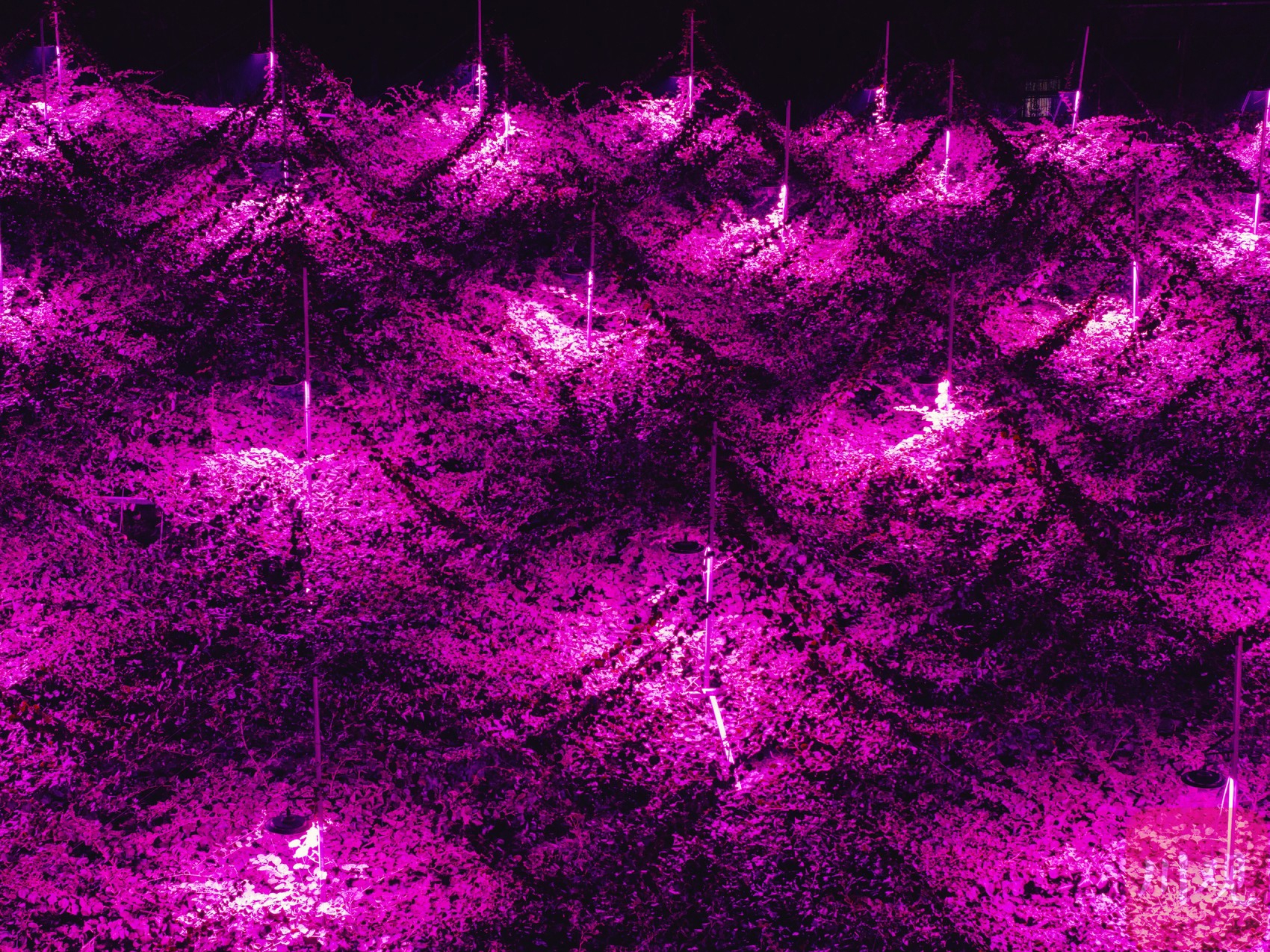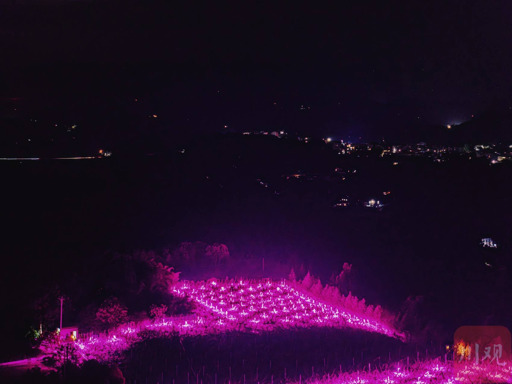 夜晚,园中的红蓝灯光照射猕猴桃。