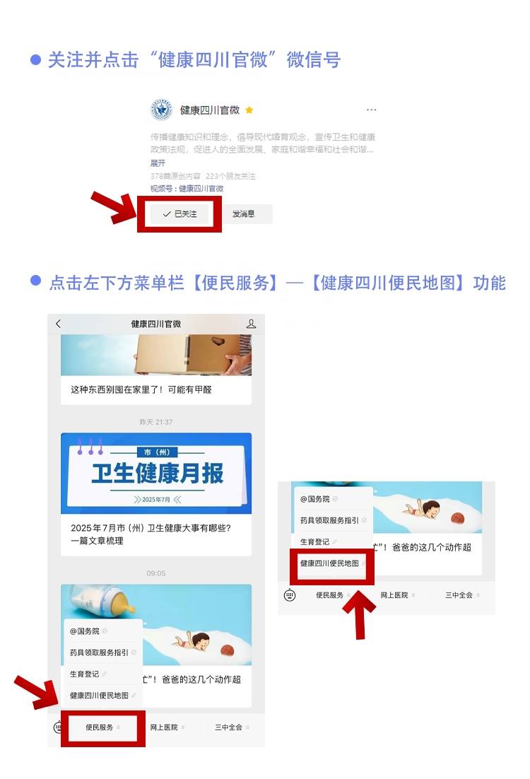 方式二:关注并点击“健康四川官微”微信公众号,点击左下方菜单栏【健康四川便民地图】功能,即可查阅。