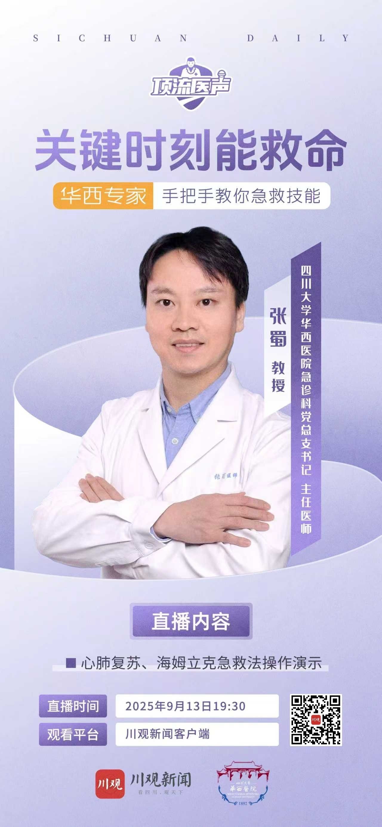 2025年9月13日是第26个“世界急救日”,川观新闻“顶流医声”直播间特别邀请到四川大学华西医院急诊科党总支书记张蜀教授,围绕急诊接诊、常见急症应对、实用急救技能等内容进行科普讲解。
