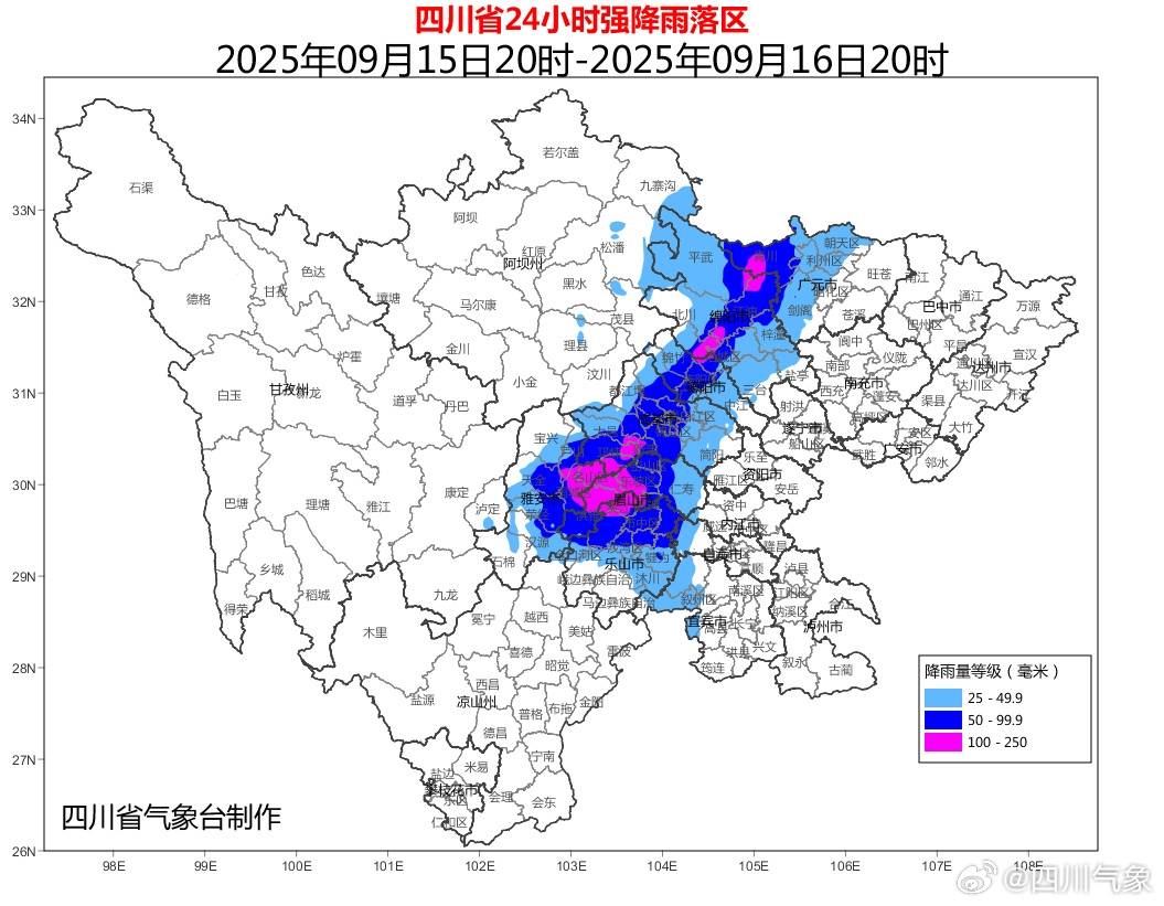 9月15日20时到16日20时:眉山、雅安、成都3市,绵阳、德阳2市中部、广元西部、乐山北部的部分地方有暴雨(雨量50~90毫米),局部大暴雨(雨量150~200毫米),最大小时雨强60~80毫米。另外,阿坝州东部有暴雨(雨量25~40毫米)。