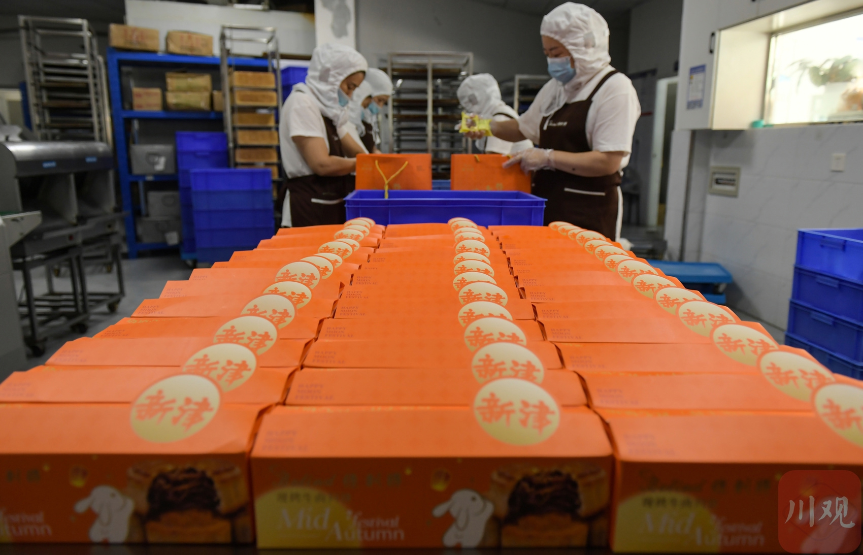2025年9月15日,在四川省成都市新津区保利得糕点坊生产车间,工作人员正在包装制作好的传统手工月饼。