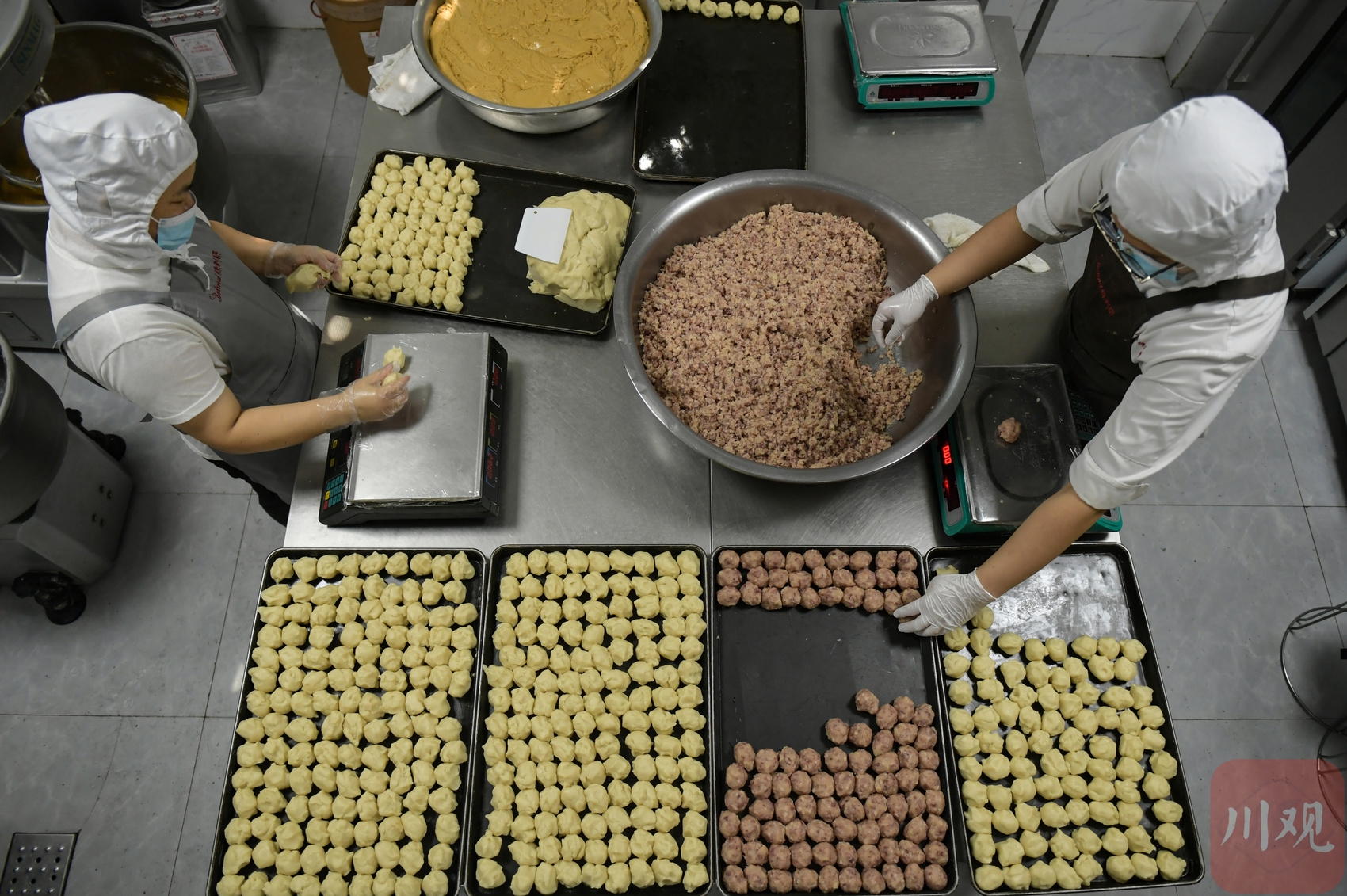 2025年9月15日,在四川省成都市新津区保利得糕点坊生产车间,工作人员为传统手工月饼配制馅料。