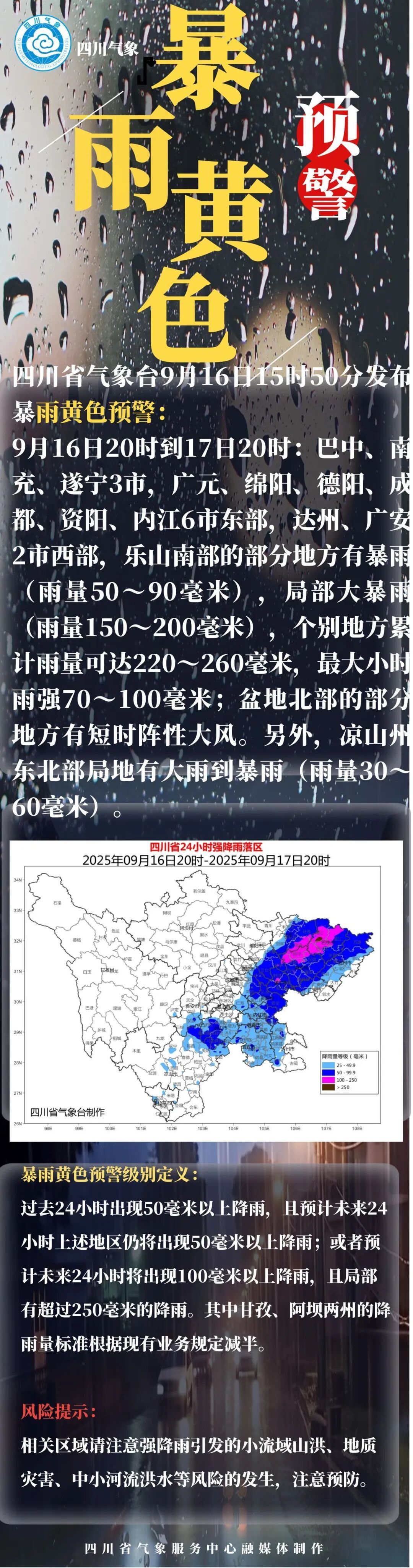 四川省气象台9月16日15时50分发布暴雨黄色预警: