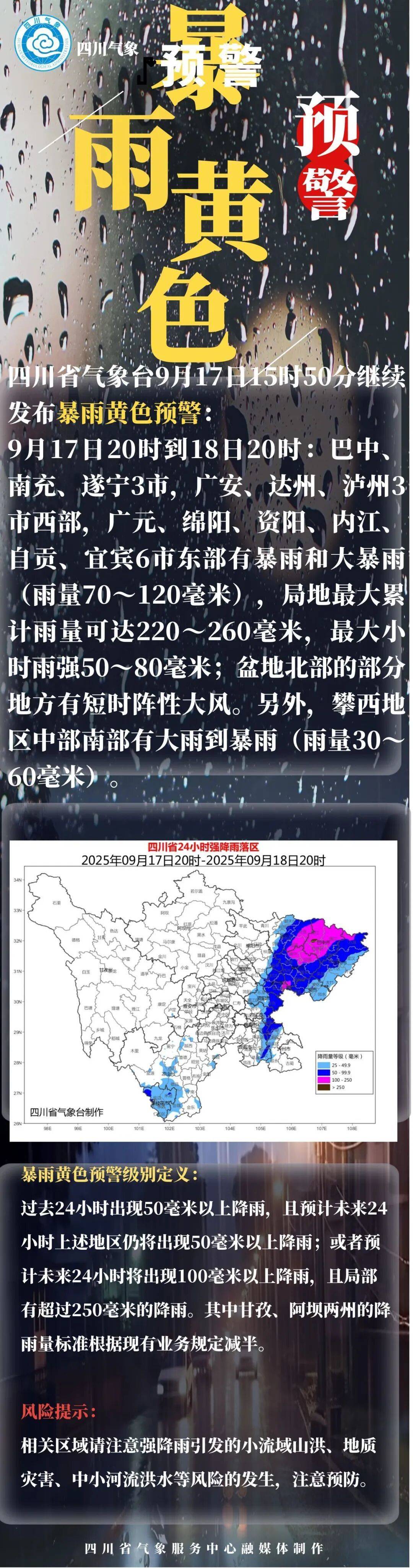 四川省气象台继续发布暴雨黄色预警,局部有大暴雨