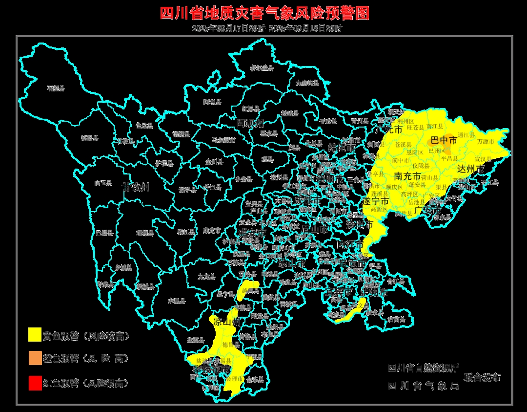 9月17日20时到18日20时:巴中、南充、遂宁3市,广安、达州、泸州3市西部,广元、绵阳、资阳、内江、自贡、宜宾6市东部有暴雨和大暴雨(雨量70~120毫米),局地最大累计雨量可达220~260毫米,最大小时雨强50~80毫米;盆地北部的部分地方有短时阵性大风。另外,攀西地区中部南部有大雨到暴雨(雨量30~60毫米)。