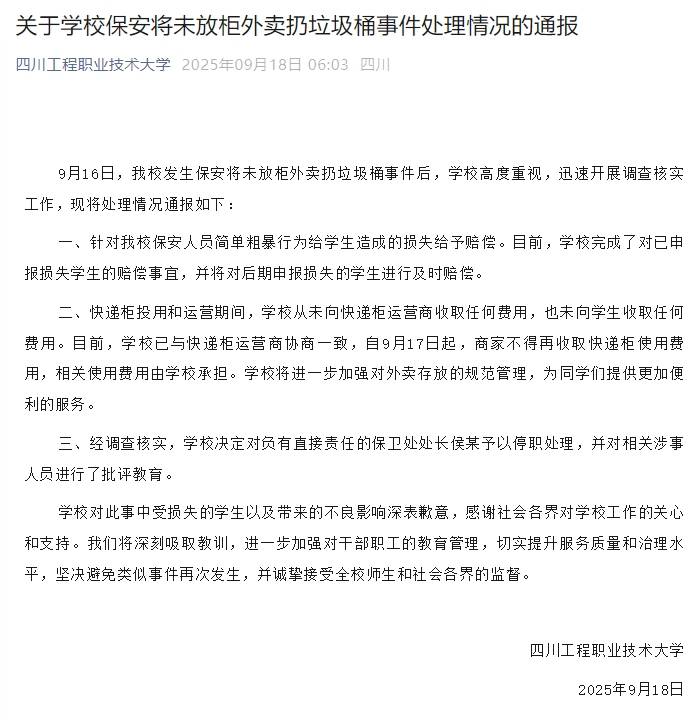 9月18日清晨6点过,四川工程职业技术大学就学校保安将未放柜外卖扔垃圾桶事件处理情况进行通报。学校对保安人员简单粗暴行为给学生造成的损失给予赔偿,对负有直接责任的保卫处处长侯某予以停职处理。