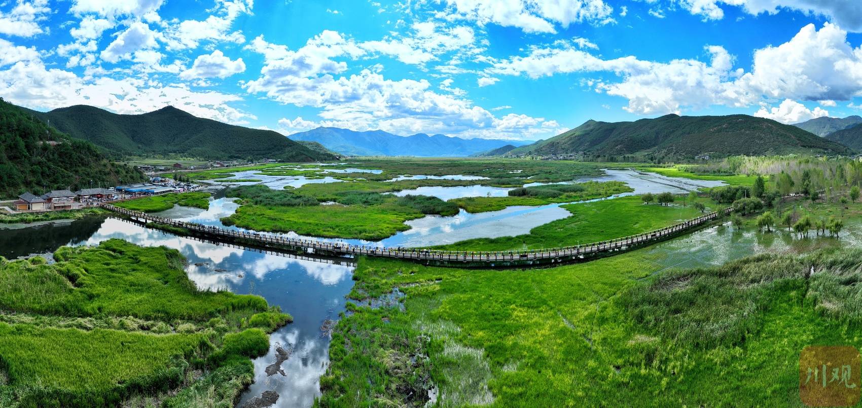走在桥上,脚下的翠绿色草海正悄然随秋意变换——夏日常见的浓绿慢慢褪去,转而染上浅绿,间或点缀几缕微黄。灰褐色的木桥蜿蜒穿梭于湿地间,桥身与水中浮动的白云倒影交叠,勾勒出静谧又诗意的景致。游客们或漫步赏景,或驻足拍照,在水天一色的自然意境里,静静感受摩梭文化的独特韵味。