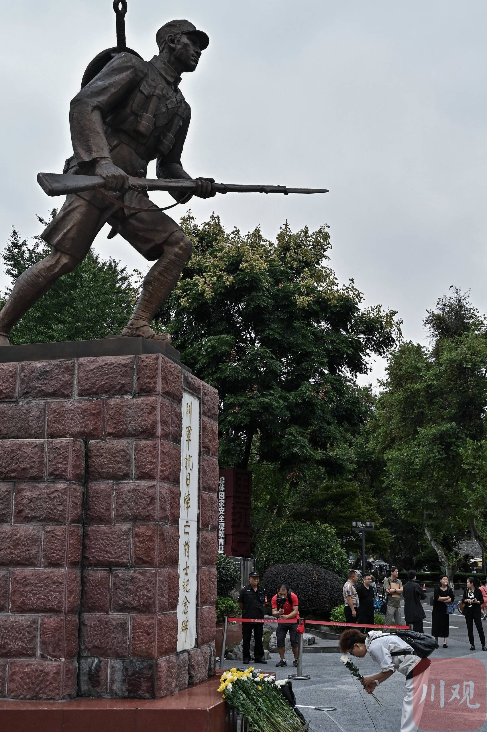 在这个特殊的日子里,位于成都市人民公园内的川军抗日阵亡将士纪念碑前,众多市民、学生自发前来瞻仰缅怀,敬献鲜花,接受爱国主义教育。