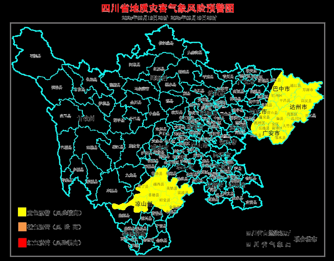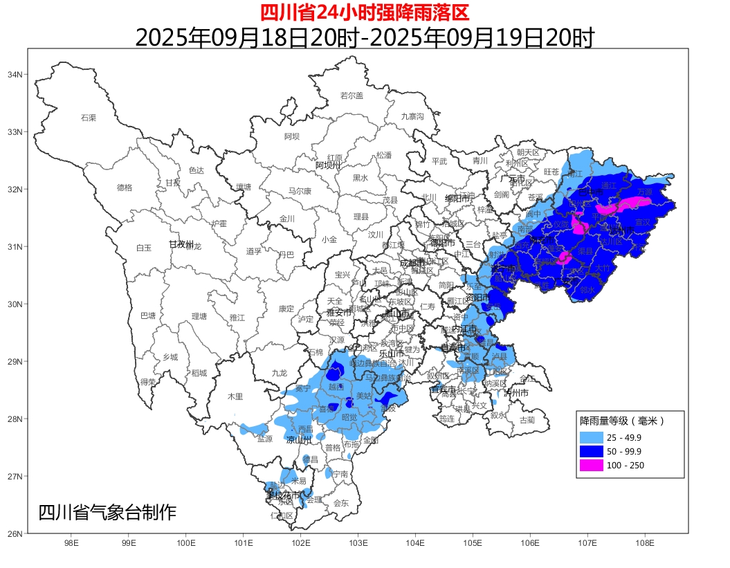 9月18日20时到19日20时:达州、广安、巴中、南充、遂宁5市,资阳、内江、自贡3市东部,宜宾、泸州2市北部,乐山市南部及凉山州北部有大雨到暴雨(雨量40~80毫米),局地大暴雨(雨量120~160毫米),最大小时雨强30~50毫米。
