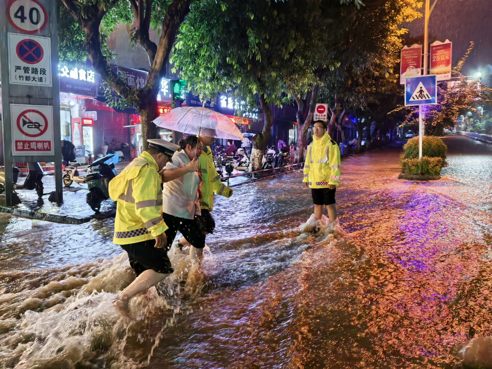 暴雨突袭,长宁县公安交警、综合执法、园林等多部门组织100余名环卫工人、城管队员、12台环卫作业车辆同步奔赴一线,对县城全域展开拉网式排查处置。