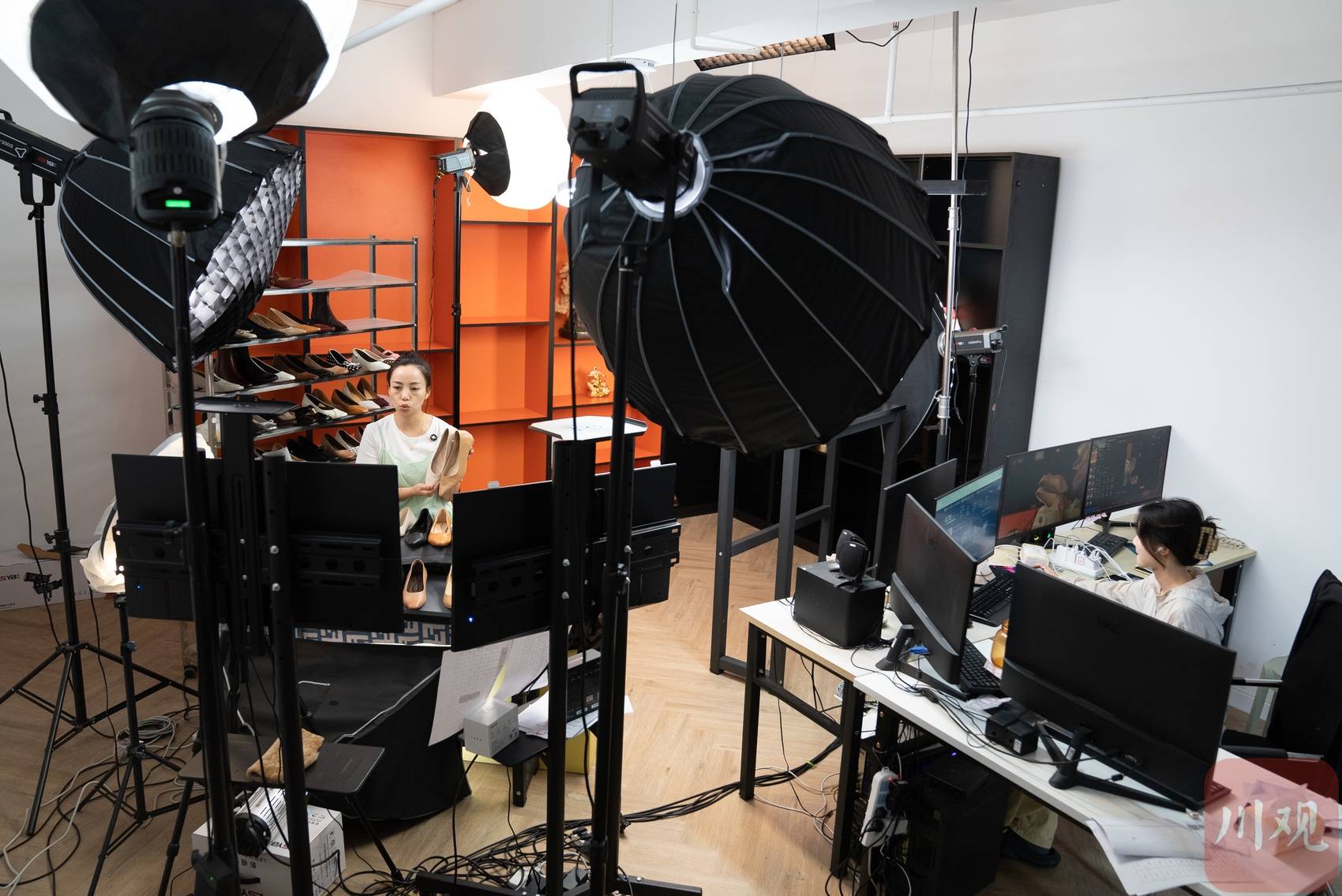 作为成都聚团科技有限公司打造的女鞋品牌,该公司在产业园4楼打造了一个时尚靓丽的体验展厅,现场不仅有顾客可线下试穿体验,同时还有数名主播在直播卖鞋。