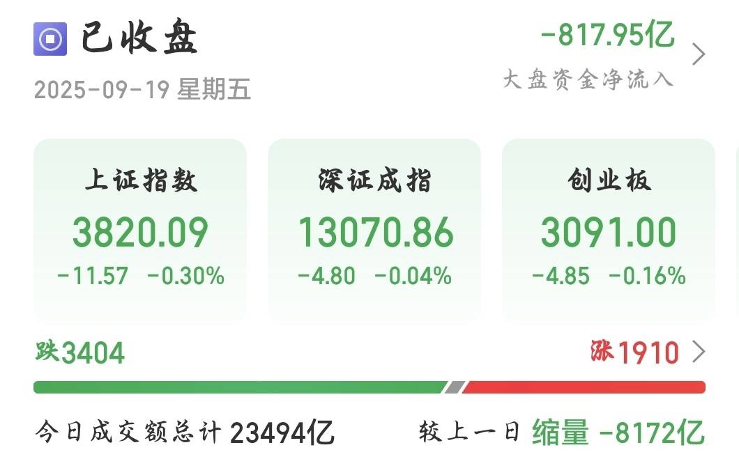 9月19日,A股市场表现集中在两条外部消息上——马斯克一则辟谣直接砸盘机器人板块,而英伟达入股英特尔的“美股映射”效应撑起科技板块。再叠加国庆前资金谨慎,市场呈现出“缩量调整+个股普跌”的格局。截至收盘,沪指微跌0.3%失守3848点支撑;深成指近乎平盘,微跌0.04%,报收13070.86点;创业板指下跌0.16%,报收3091点。尽管指数跌幅有限,但全市场超3400只个股下跌,赚钱效应较弱。量能方面,沪深京三市成交额达2.35万亿元,较昨日减少8172亿元,缩量调整特征明显。