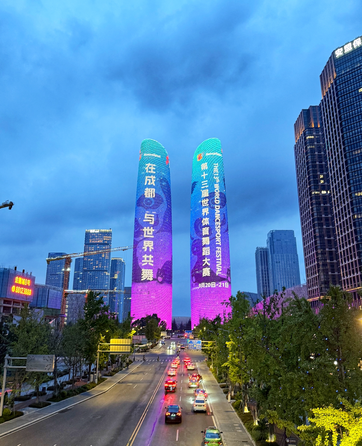第十三届世界体育舞蹈大赛开幕的同时,成都“双子塔”也再次为赛事亮灯,“在成都 与世界共舞”光耀蓉城!