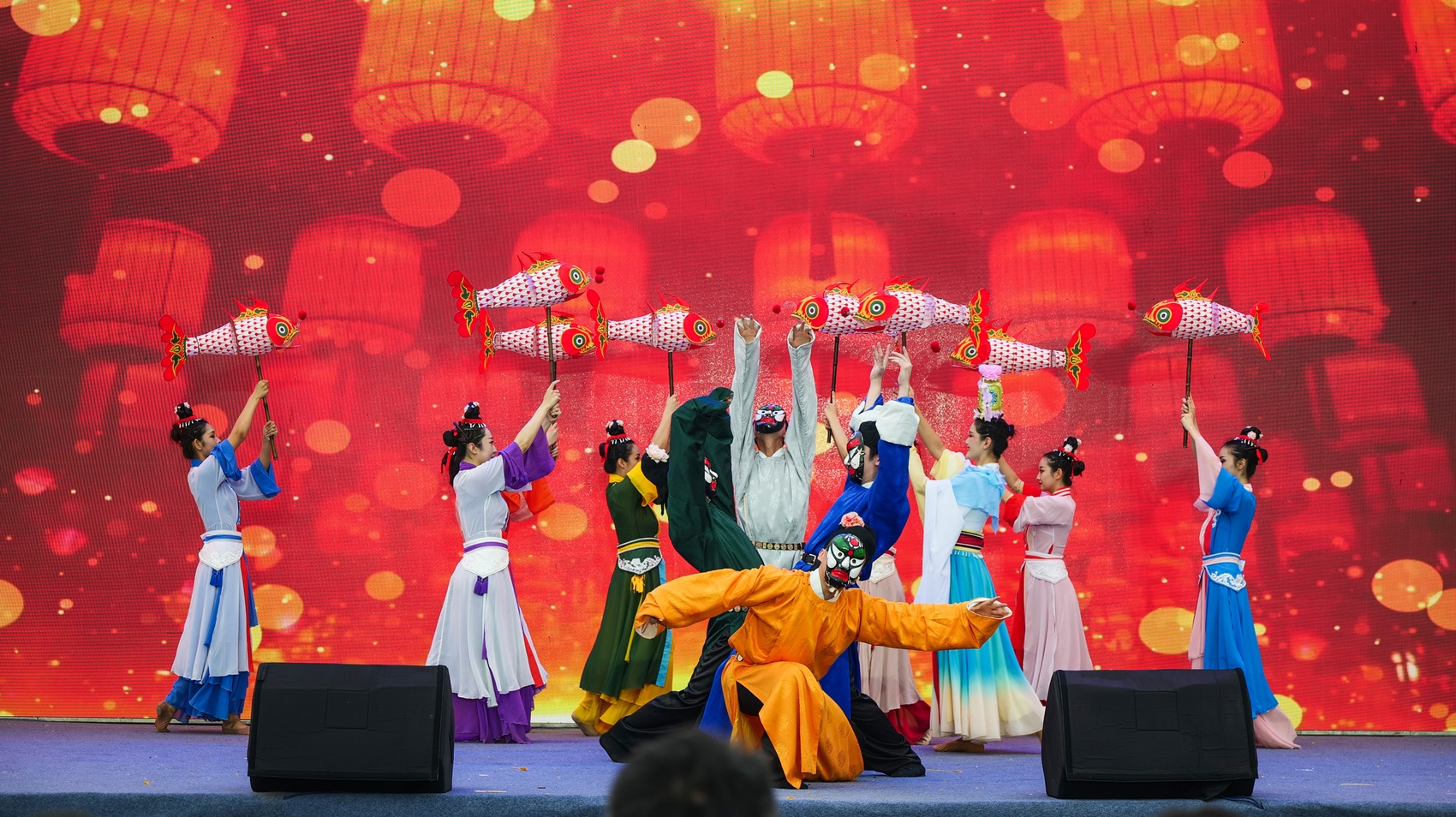 在开幕的“启航·丰收序曲”中,欢乐的“祥狮”踩着铿锵鼓点率先登场,高桩跳跃、辗转腾挪间完成“采青”绝技,红绸对联“庆农业丰收·享美好生活”应声展开。