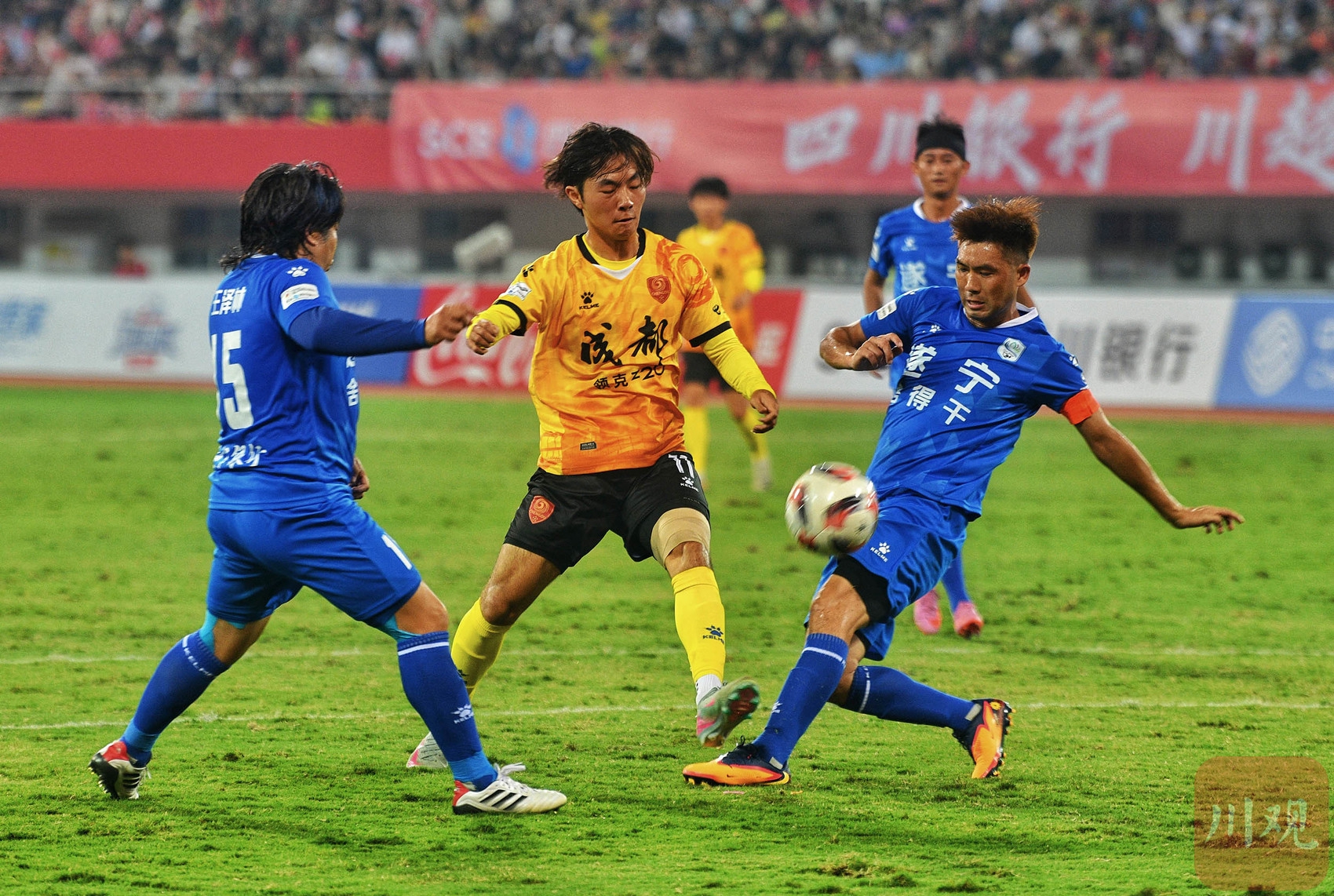 成都锦城队员(黄衣)与遂宁舍得干队争抢。