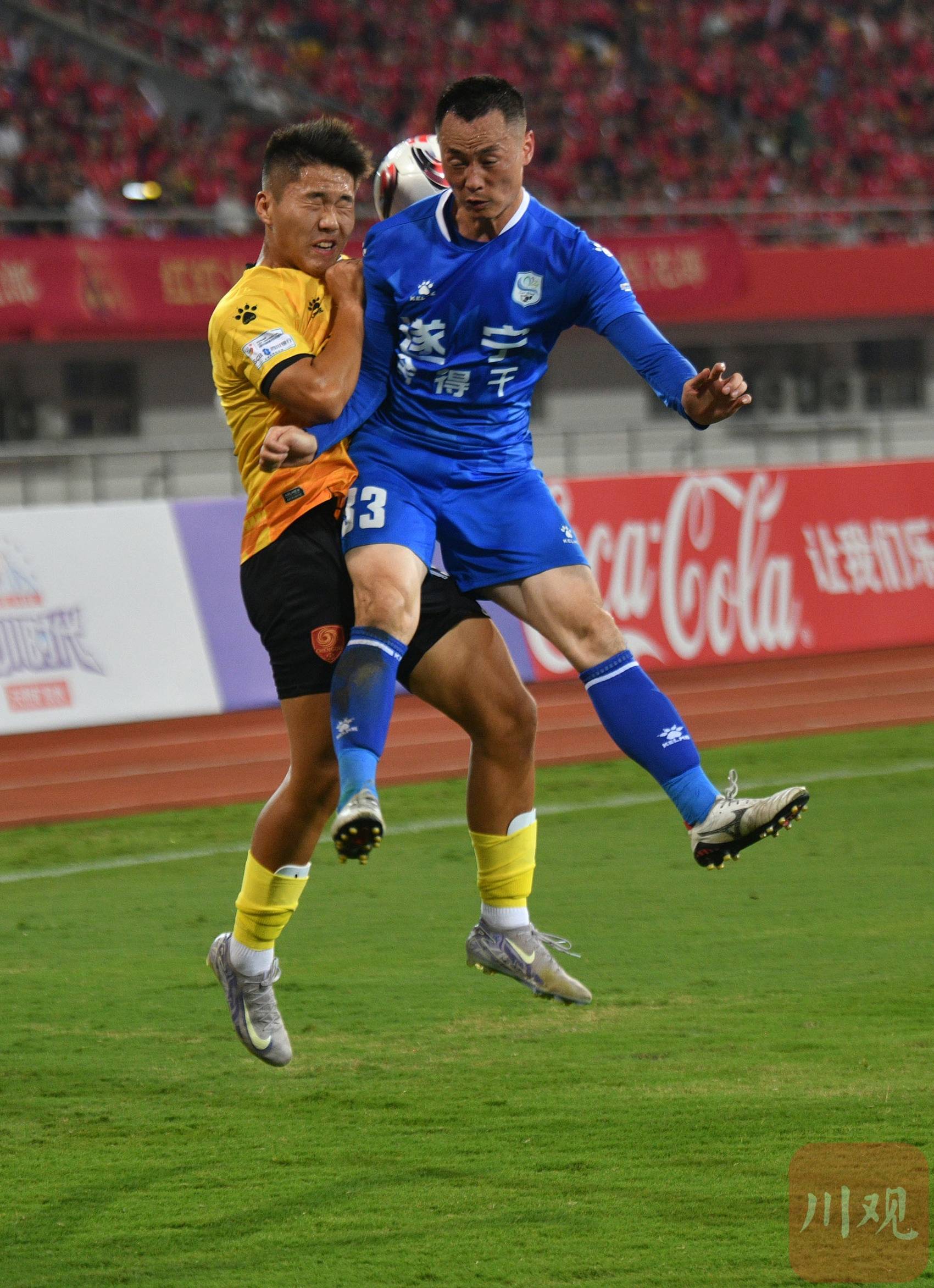 成都锦城队员(黄衣)与遂宁舍得干队员争顶。