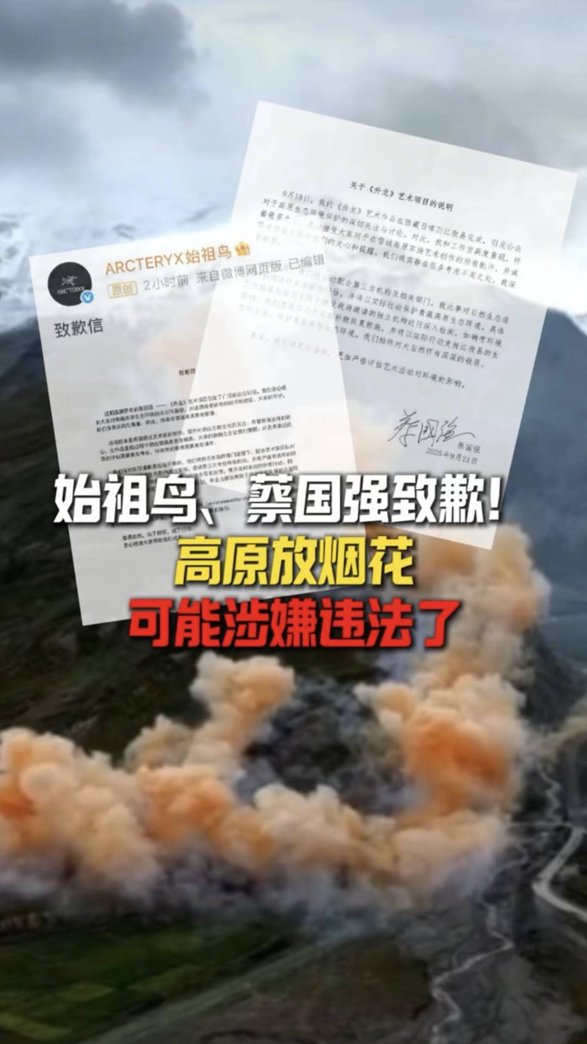 虽然事后,面对强大的舆论压力,9月21日上午8点左右,始祖鸟和蔡国强工作室分别发布道歉信。但是,在小铭看来,蔡国强烟花秀仍然可能涉嫌违法。